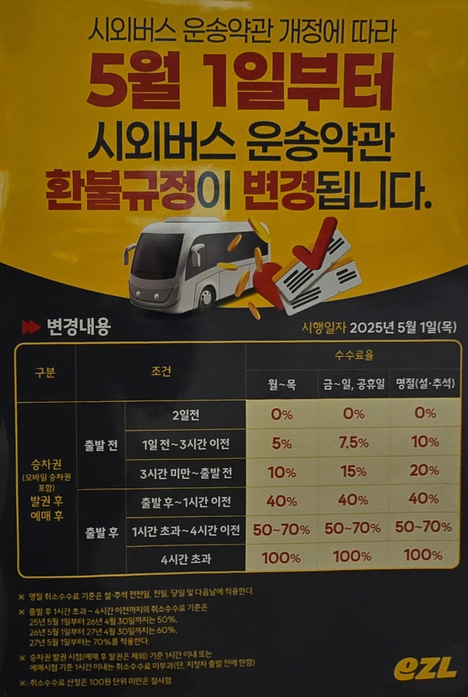 2025년 5월 1일 부터 승차권 구매후 환불할 경우에 위약금 환불 규정이 변경되어 크게 버스 출발전,출발 후로 나뉘고,환불 시점이 월~목요일,금~일 공휴일,명절(설,추석)에 따라 취소 수수료가 다르게 공제되어 환불 된다.