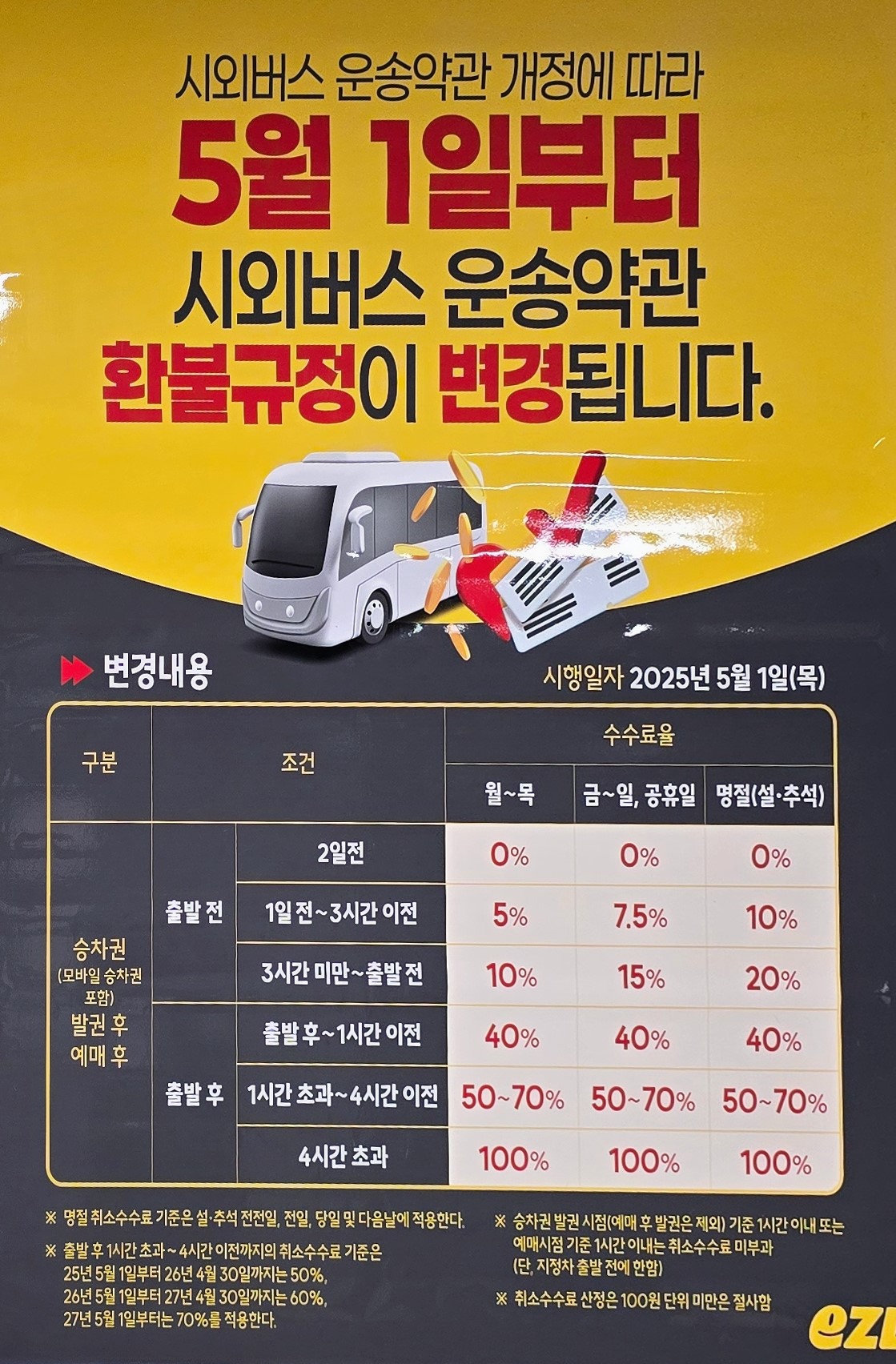 고속버스와 시외버스 승차권을 예매후 잦은 취소에 의한 노쇼 문제를 개선하고 버스 이용 효율성을 높이기 위해서 2025년 5월 1일 부터 승차권 환불 규정이 변경되어 실시되고 있다.