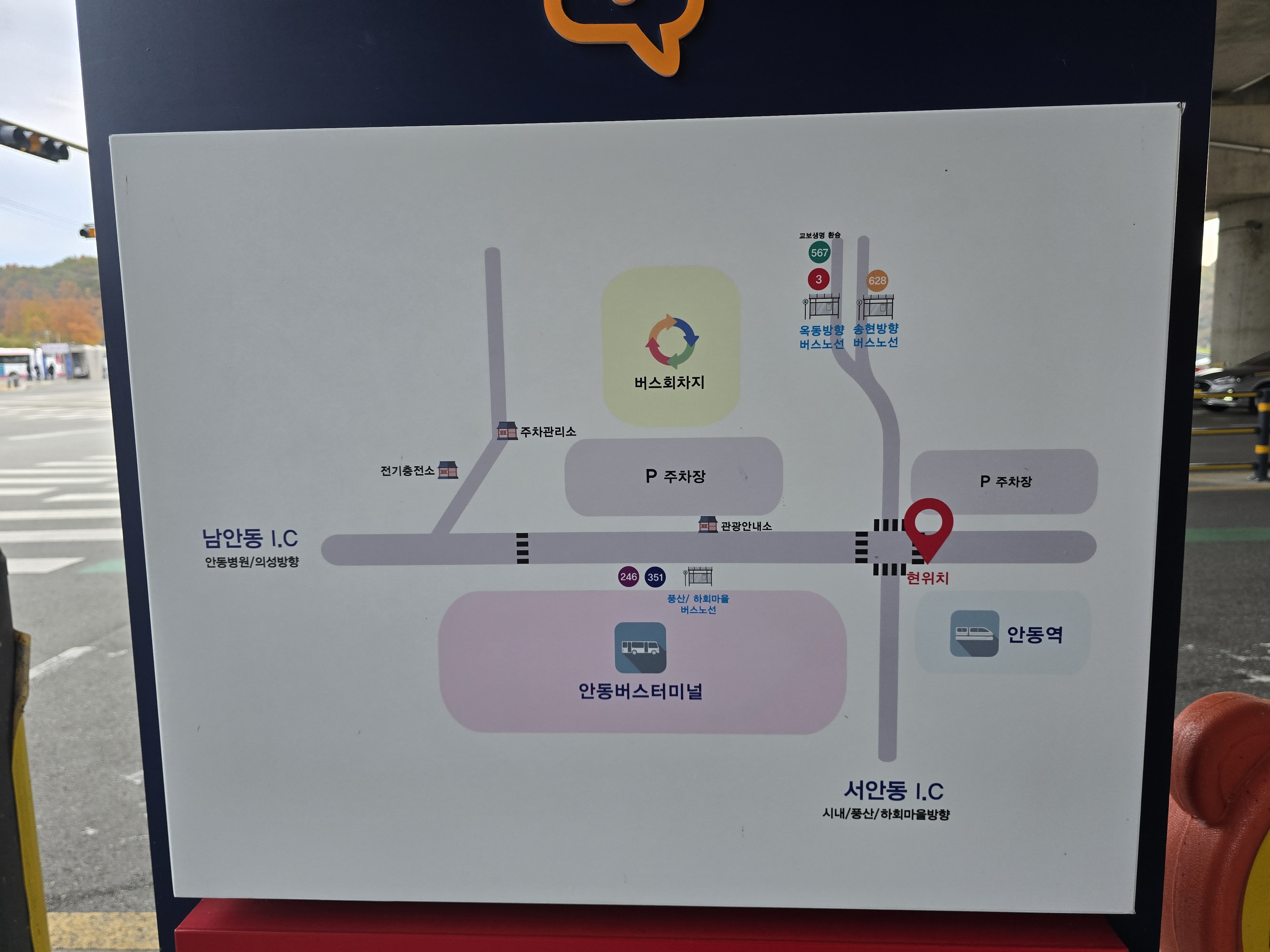 안동역 옆에 위치한 안동터미널은 열차와 시내버스 환승이 편리하게 인근 100m 이내 거리에인접해 있는 시외,고속버스터미널로,도로명 경북 안동시 경동로 130에 위치하고 있다.