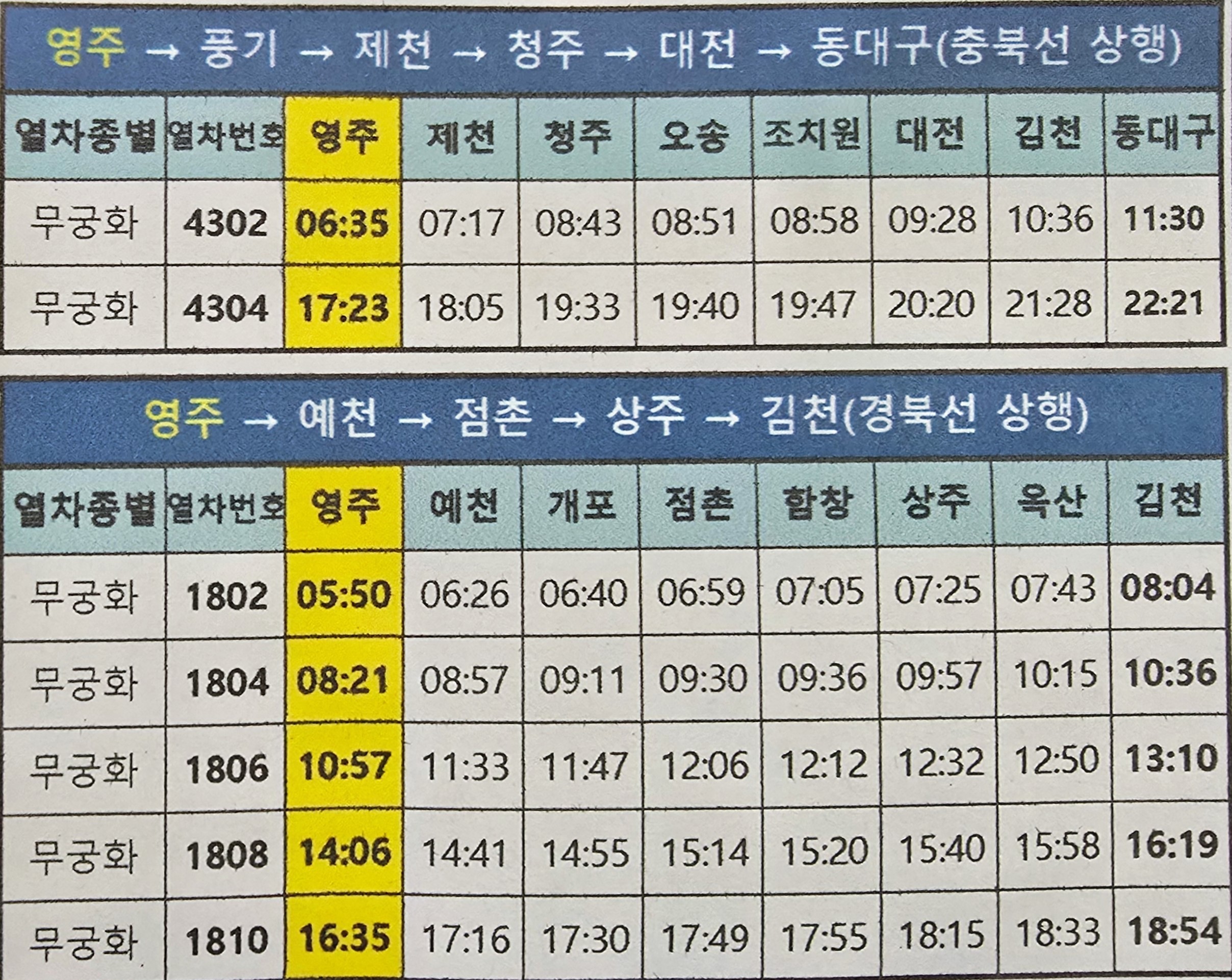 영주역에서 동대구가는 무궁화호 열차는 06시35분에 영주역을 출발하여 풍기,단양,제천,충주,주덕,음성,증평,청주공항,오근장,청주,오송,조치원,부강,대전,옥천,이원,심천,영동,황강,김천,구미,왜관,대구역을 거쳐서 동대구역까지는 약 4시간 55분이 소요되고 요금은 24,500원이다.