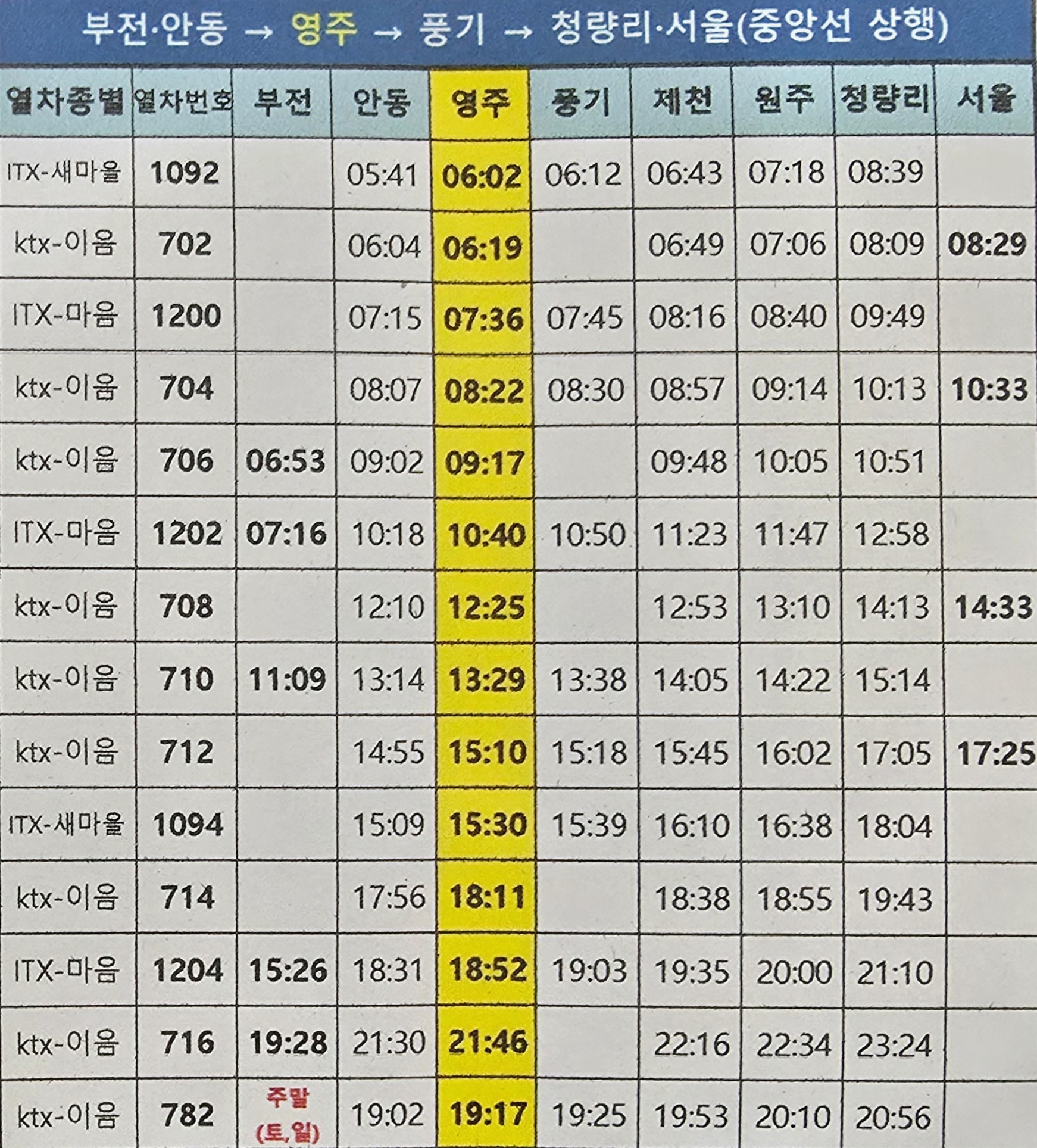 영주역에서 서울역 방면 KTX