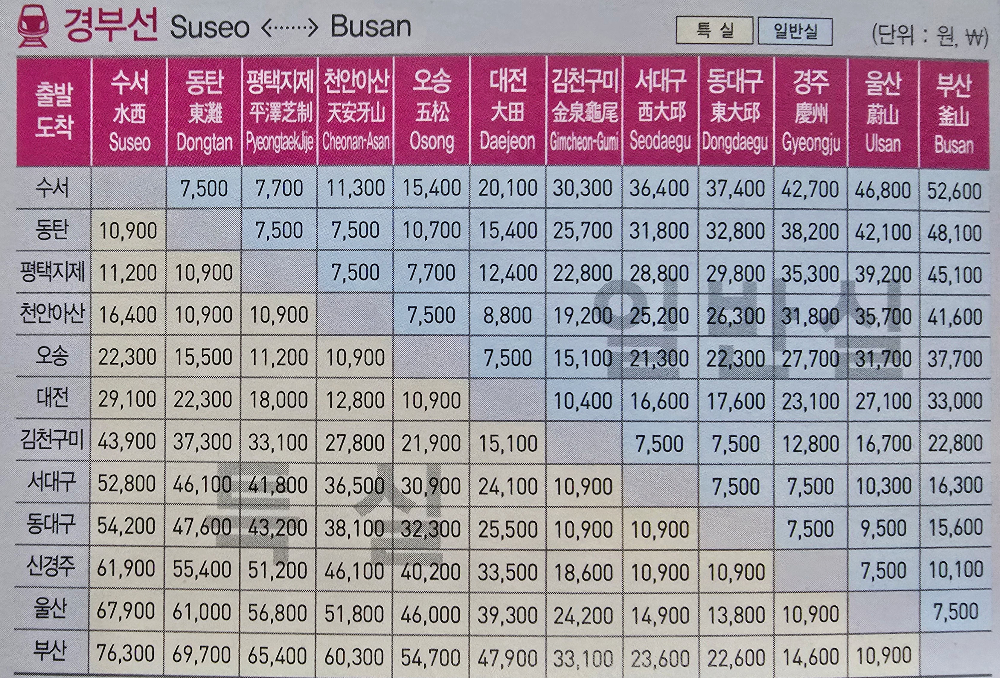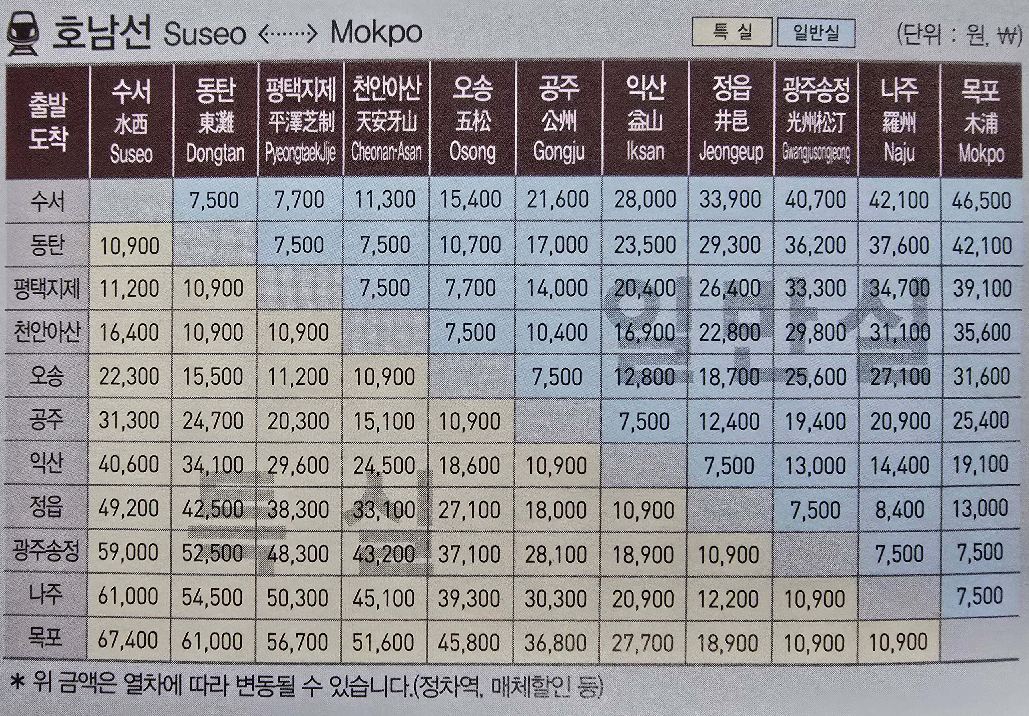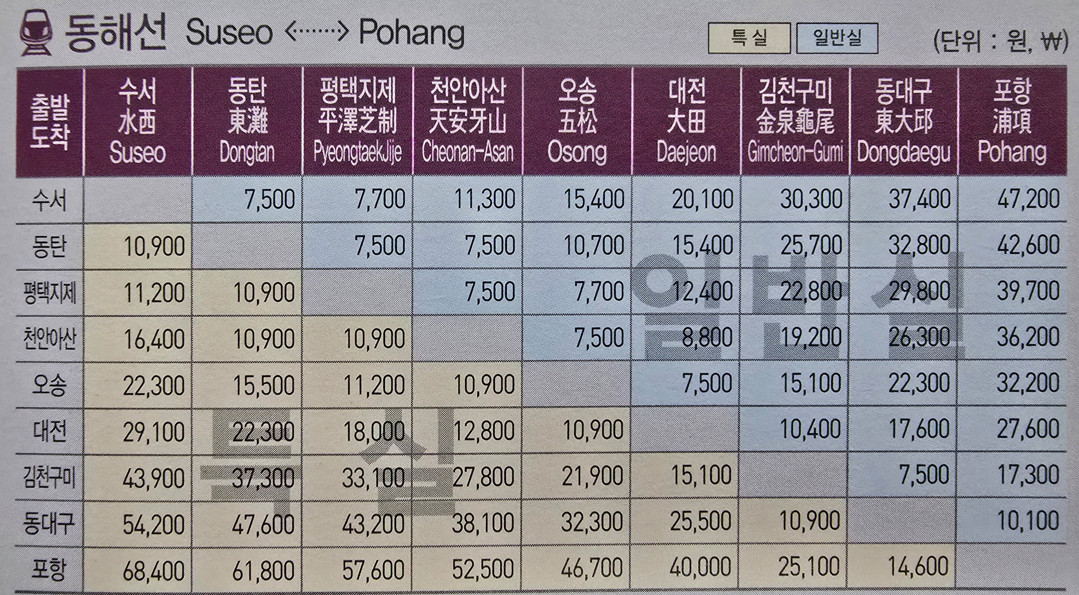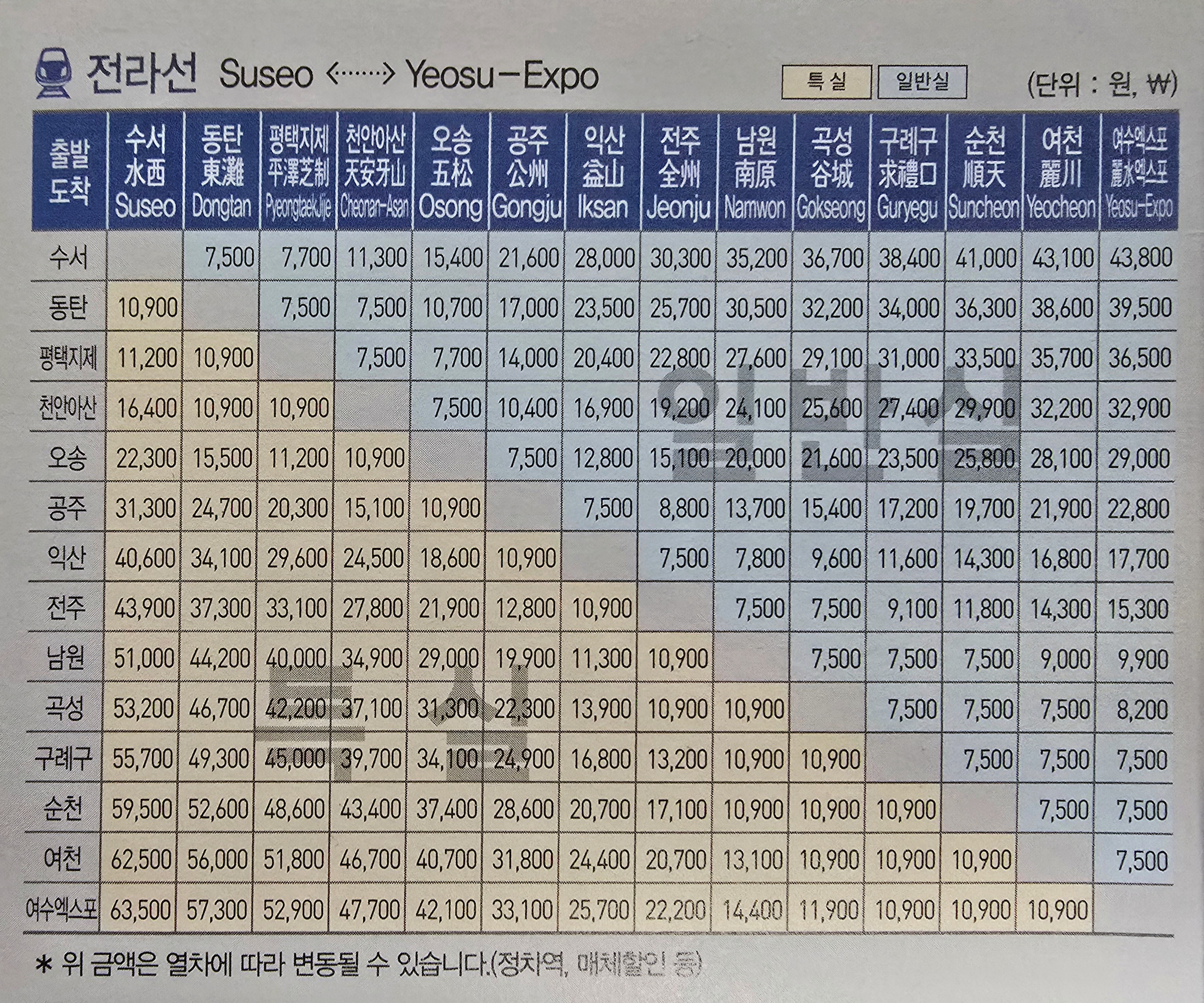 경로는 일반실은 34,900원이고,특실은 58,100원이다.