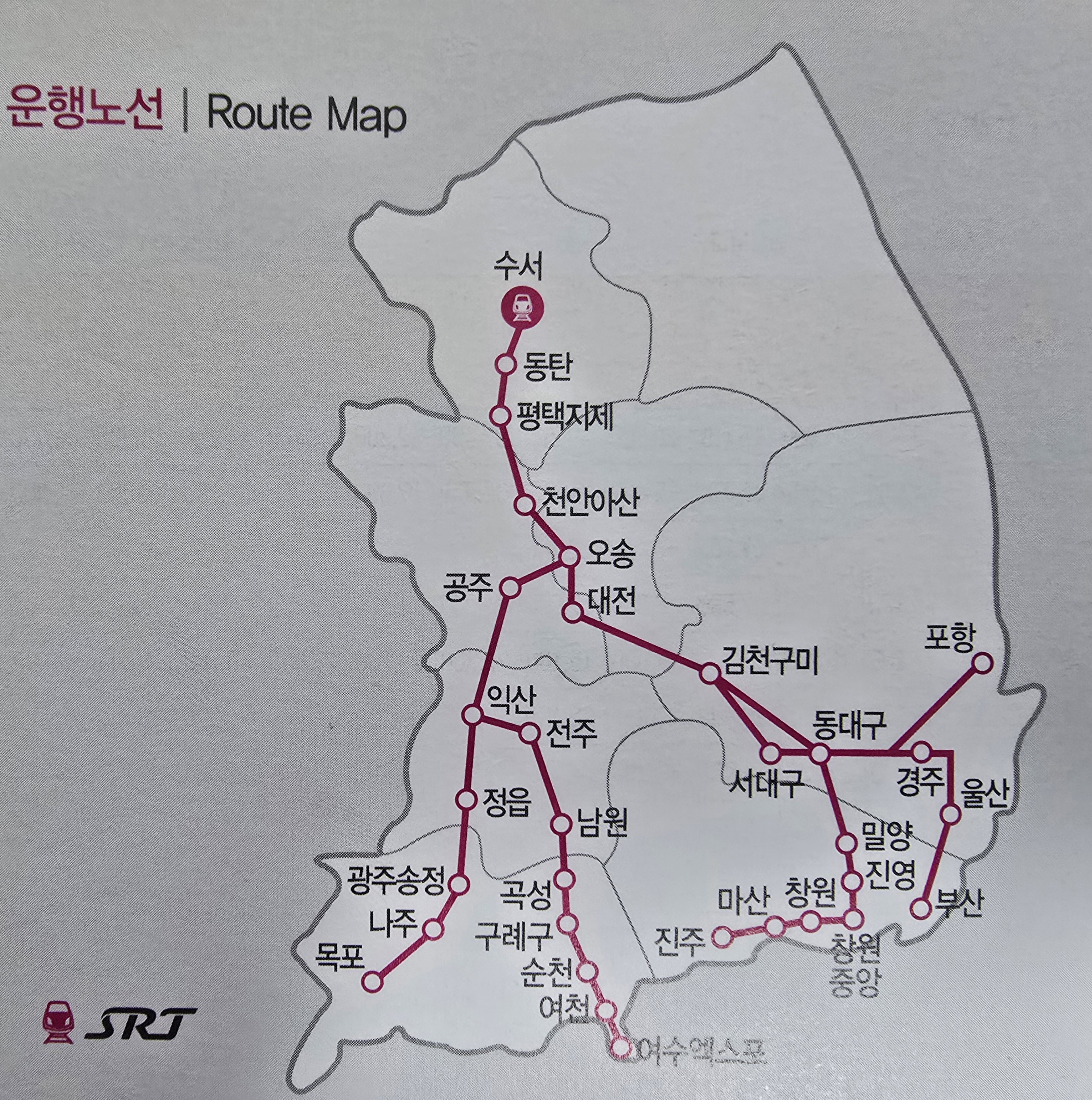 2025년 11월 27일 현재 SRT 고속철도 운행노선은 경부선(수서역↔부산역),호남선(수서역↔목포역),경전선(수서역↔마산,진주역),동해선(수서역↔포항역),전라선(수서역↔여수엑스포역) 노선 등의 SRT가 운행되고 있다.