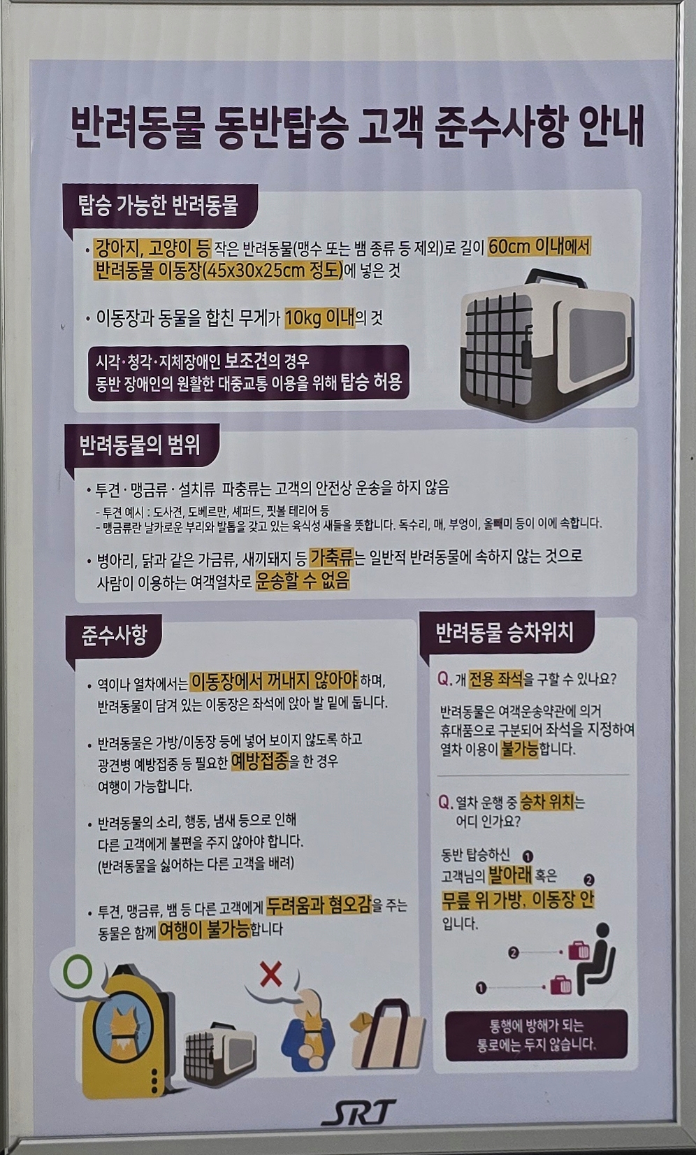 강아지 고양이 등 반려동물과 함께 SRT를 이용할 경우에는 길이 60cm 이내서 반려동물 이동장을 이용하여야 하고 이동장 과 동물의 합친 무게가 10kg 이내이어야 한다.