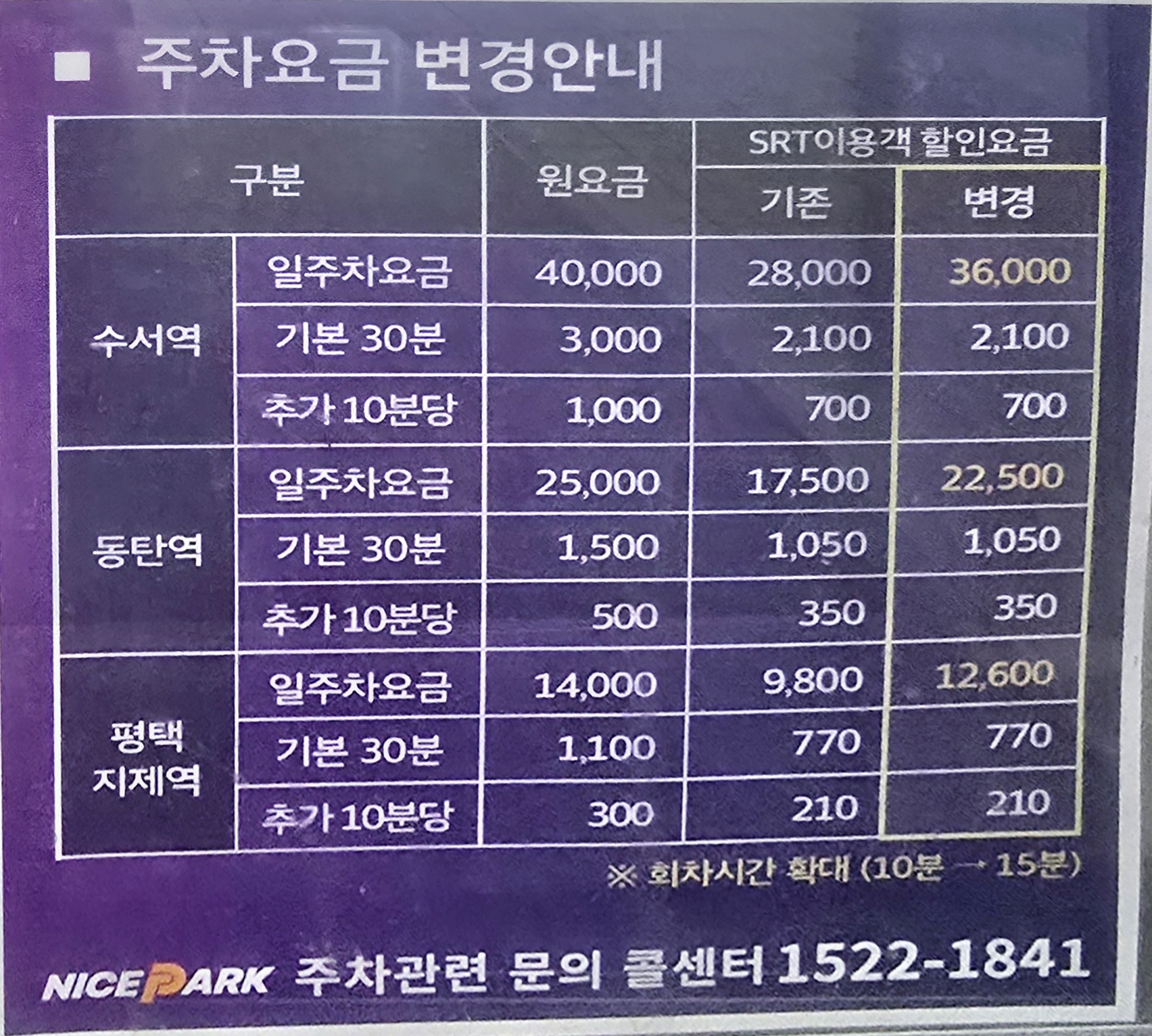 SRT 이용객은 요금을 할인 받을 수 있는데 기존에 SRT 이용객은 할인이 적용되어 일일 주차요금이 28,000원에서 36,000원으로 변경되었다.