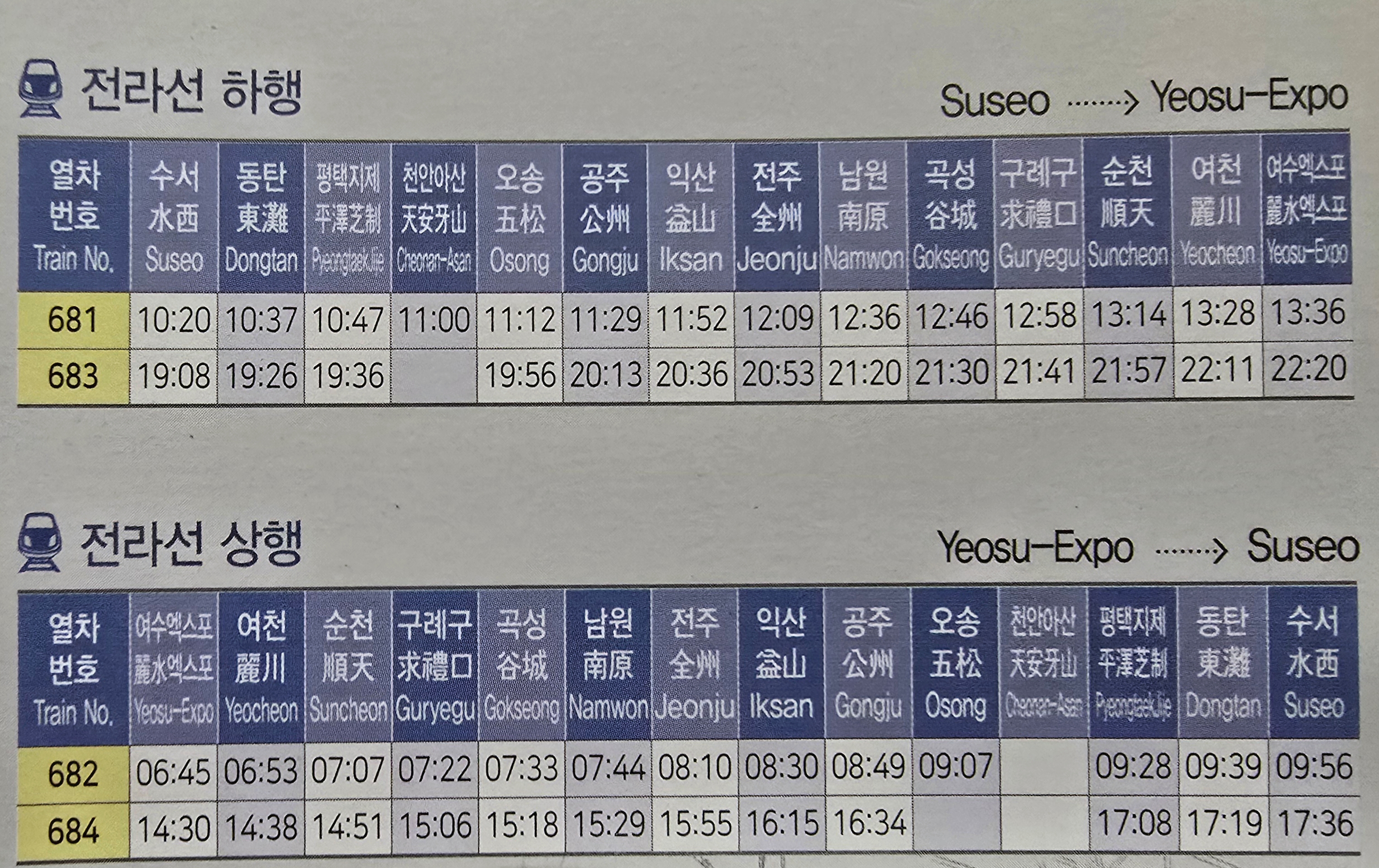 수서역에서 여수엑스포역가는 SRT는 10시20분,19시08분 하루에 2회 운행한다.