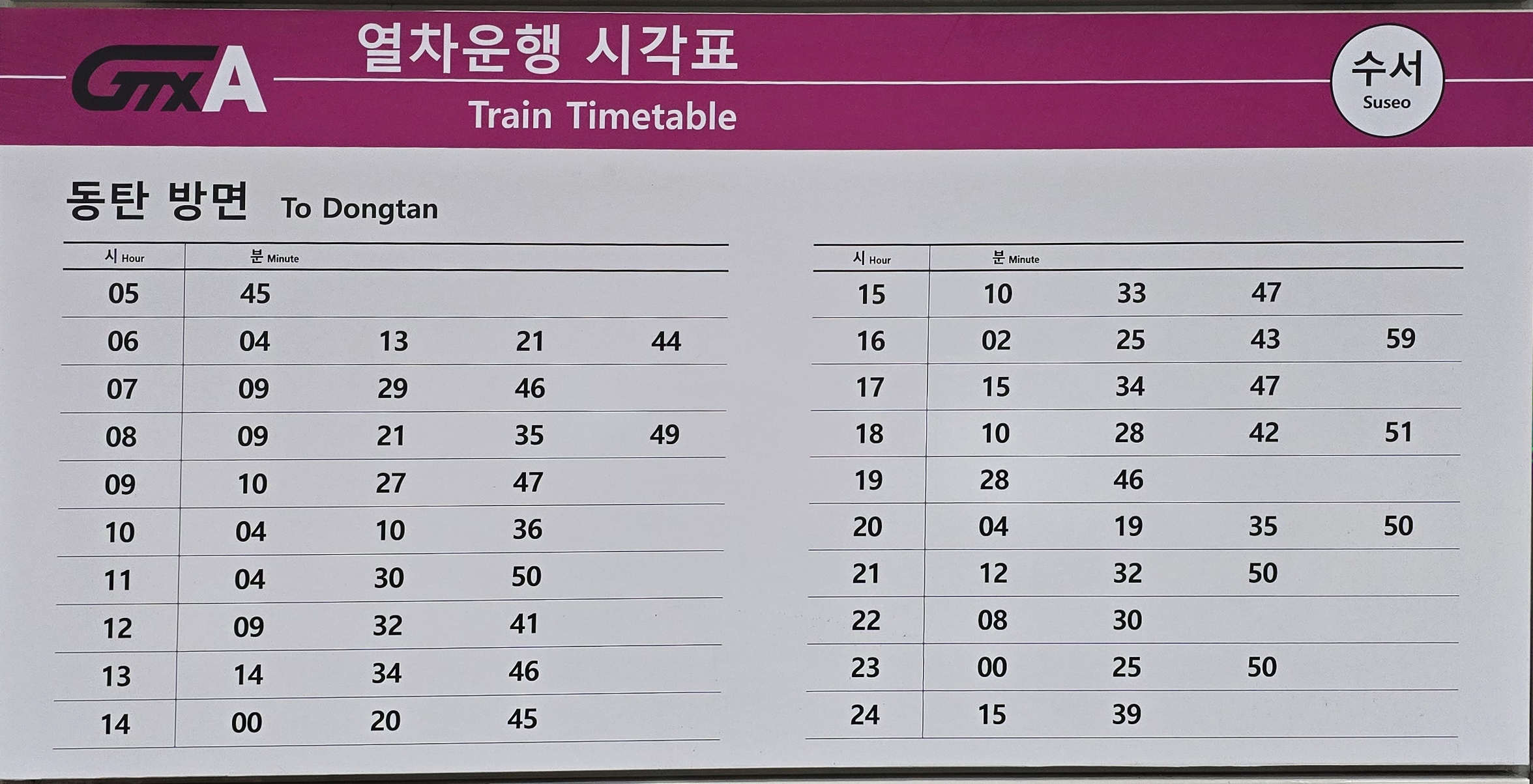수서역 GTX 동탄방면 열차는 첫차가 05시45분,막차는 24시39분에 운행한다.