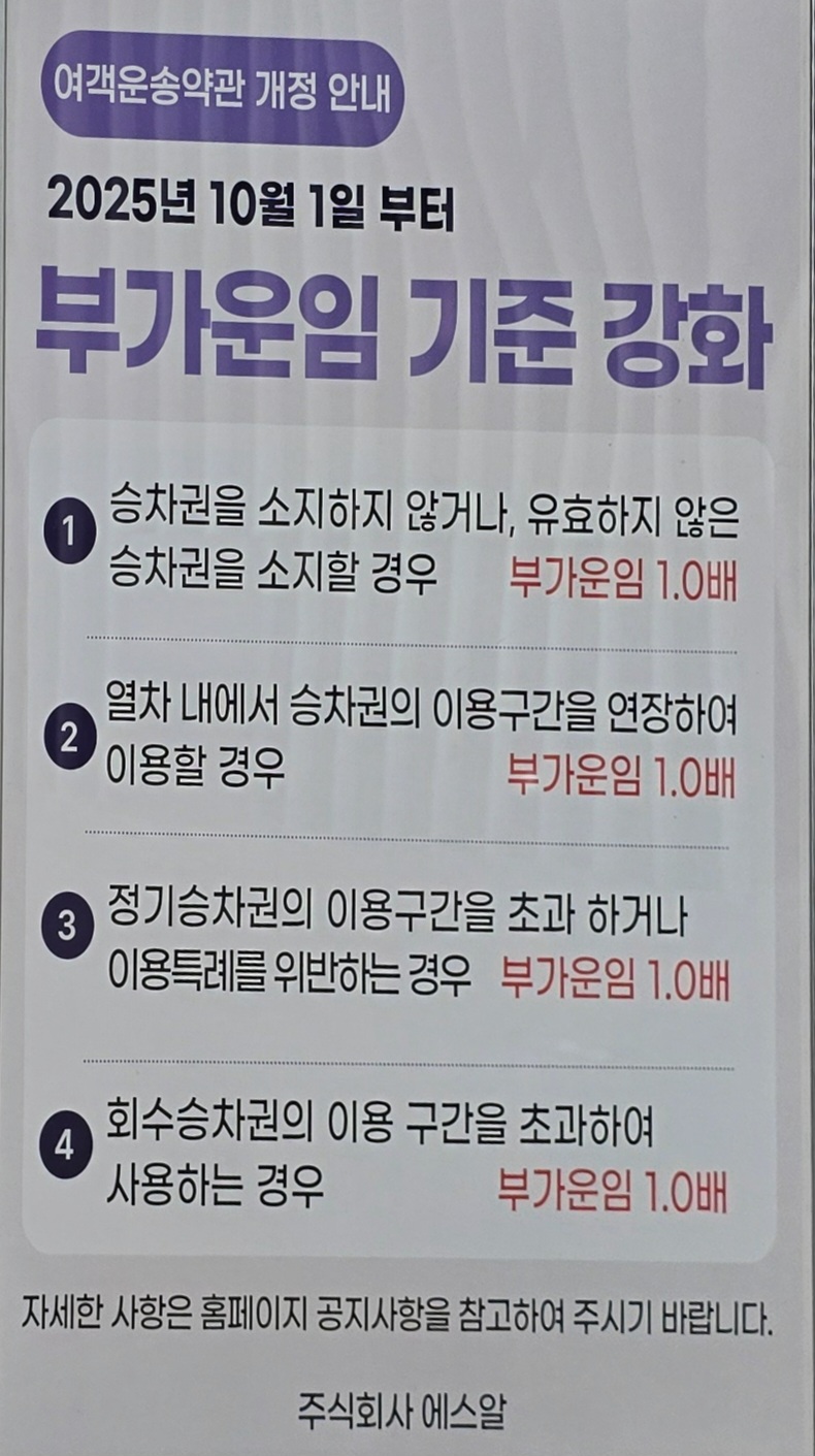 2025년 10월 1일 부터는 승차권을 소지 하지 않거나 ,유효하지 않은 승차권을 소지할 경우에는 부가운임이 승차권 요금 1배가 적용된다