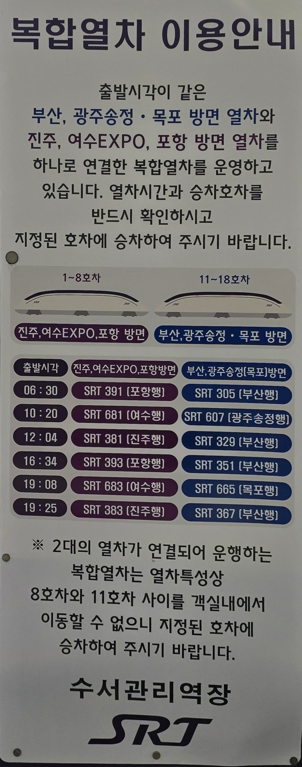 수서역에서 06시30분에 출발하는 SRT는 2개의 열차를 운행하는 열차로 반드시 탑승하실 열차번호와 해당호차를 확인후 탑승하여야 한다.