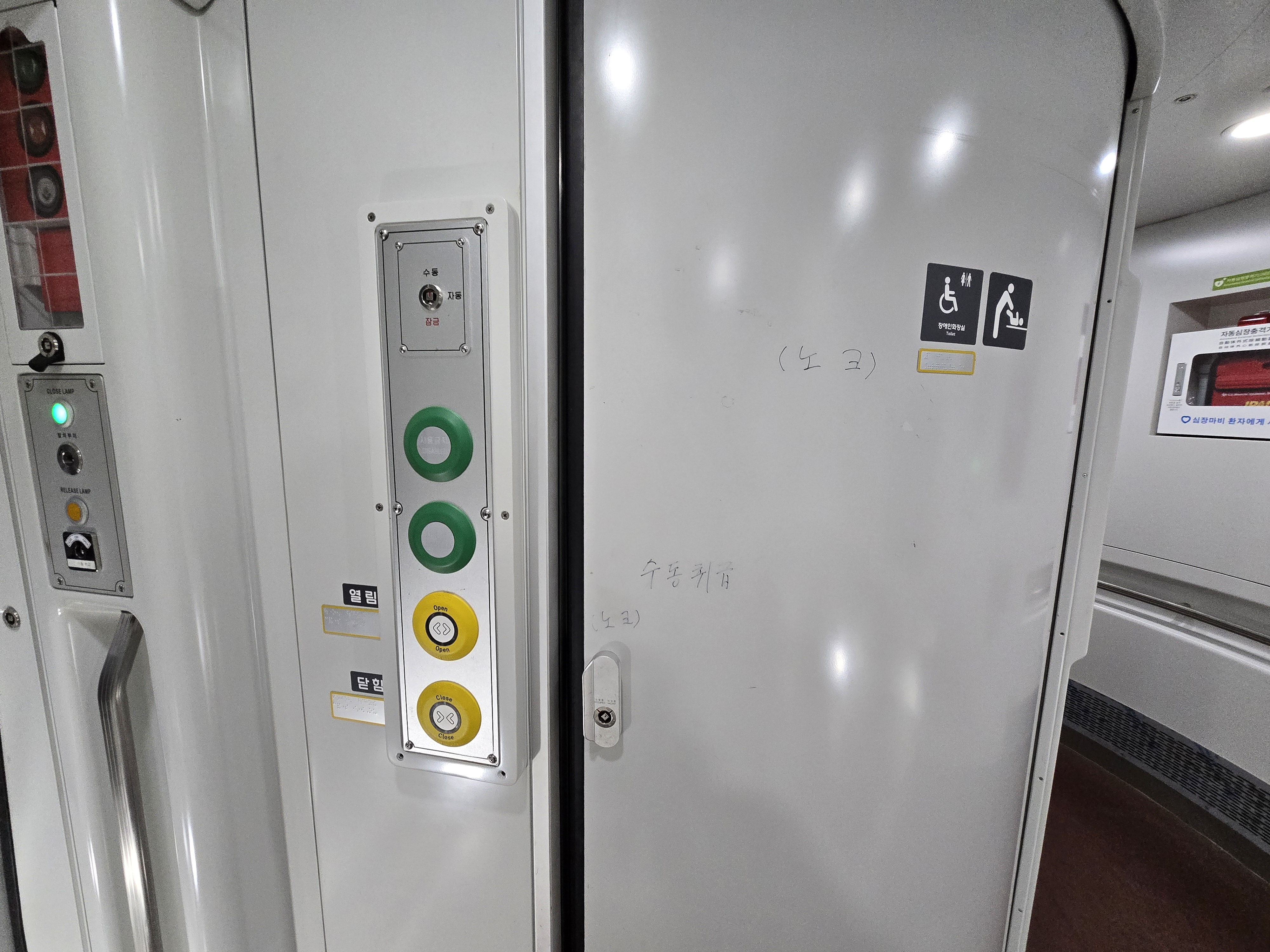 열차 내에서 화장실을 이용할 경우에는 화장실 문 옆 열림 버튼을 누르면 화장실 문이 열린다.