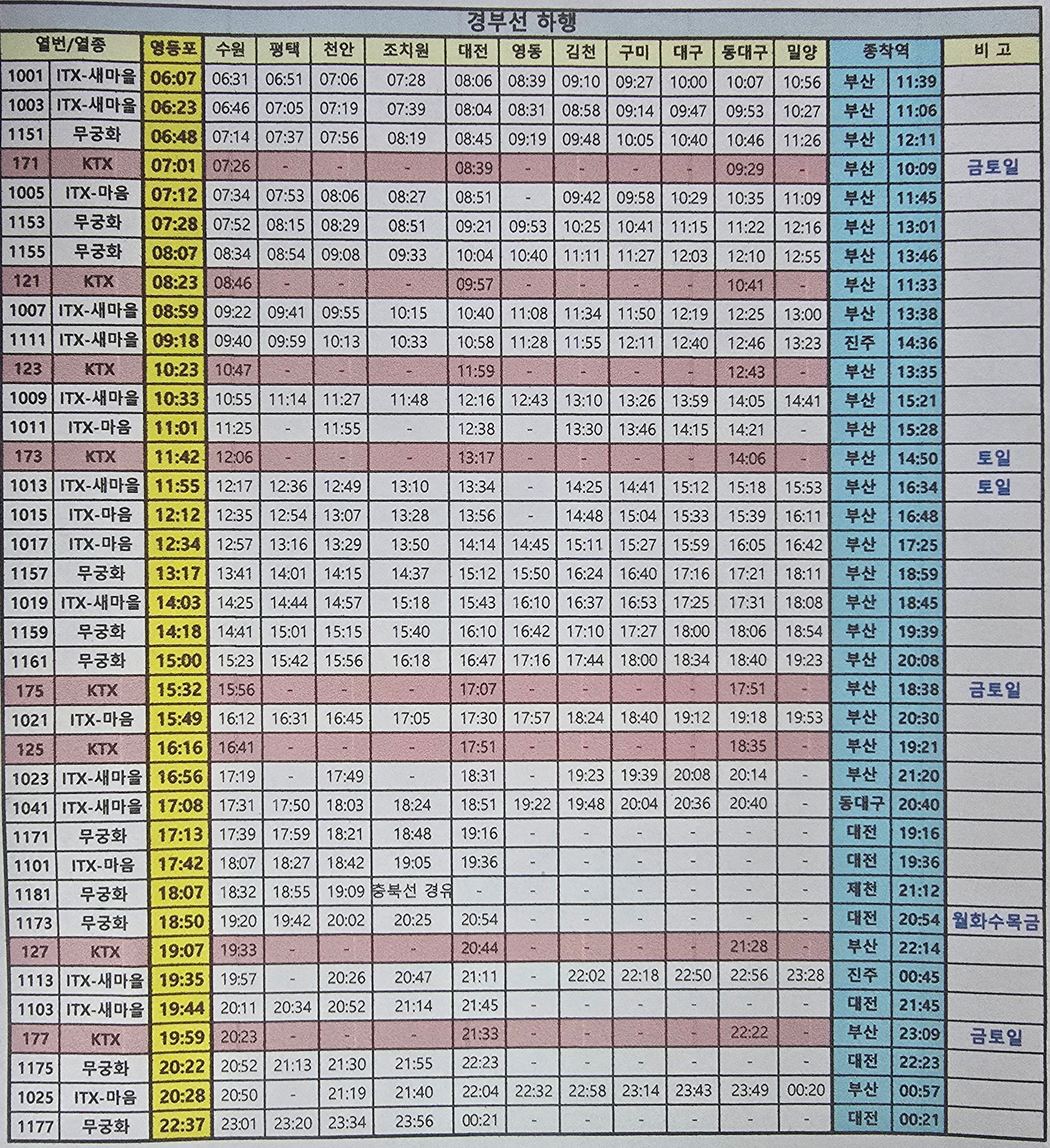 영등포역에서 부산가는 경부선 하행 첫차는 06시07분에 ITX 새마을호 열차가 수원역,평택역,천안역,조치원역,부강역,신탄진역,대전역,옥천역,영동역,황간역,김천역,구미역,왜관역,대구역,동대구역,경산역,청도역,상동역,밀양역,삼랑진,구포역을 거쳐서 부산역에는 11시39분에 도착한다.