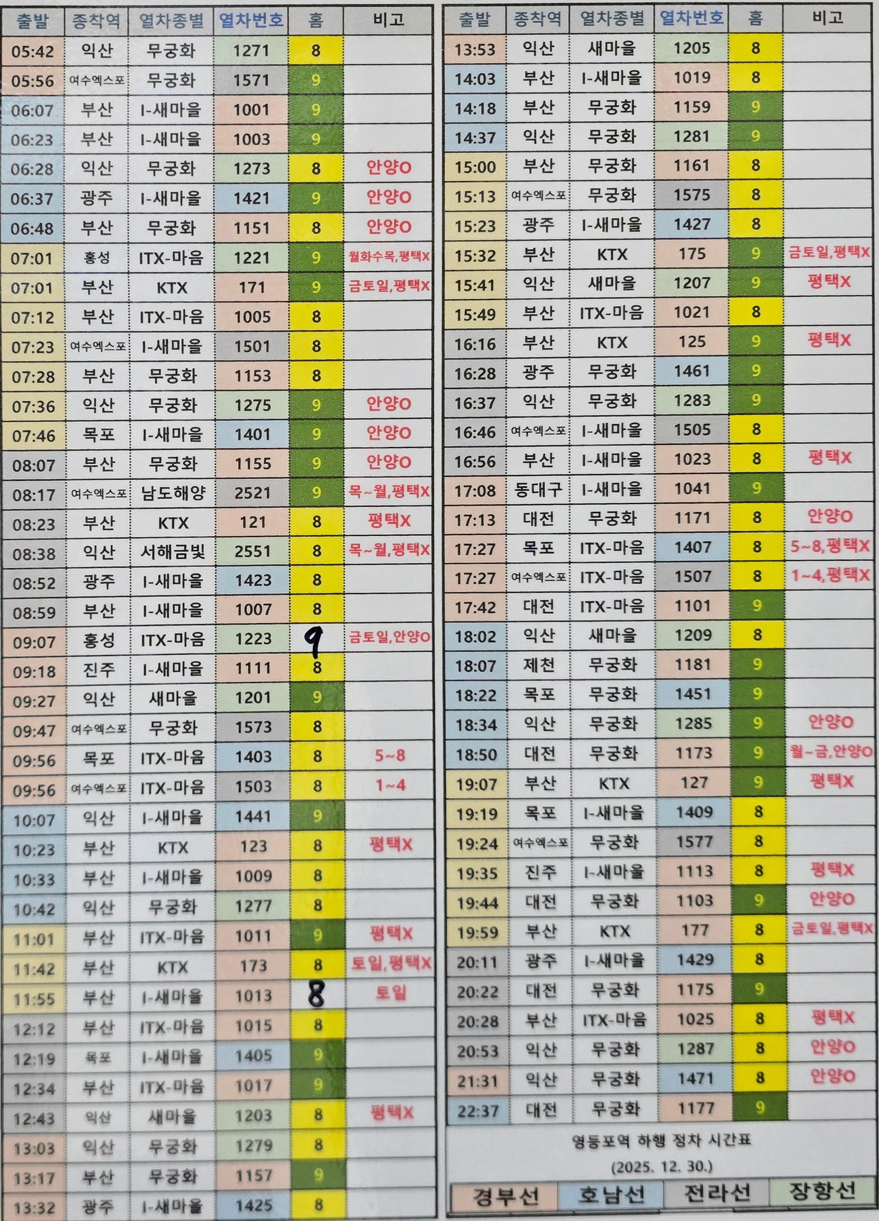 영등포역 기차 시간표는 2025년 12월 30일 최종적으로 시간표 변경이 있었고,2026년 1월 13일 현재는 동일한 기차 시간표로 열차가 운행하고 있다.