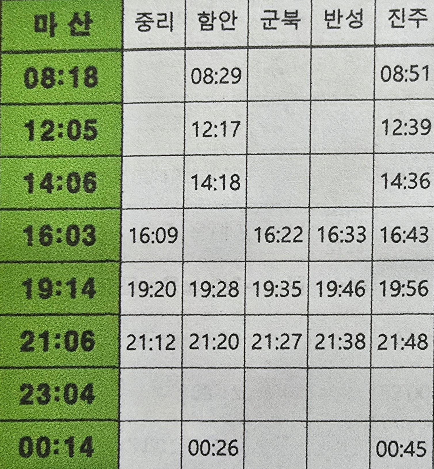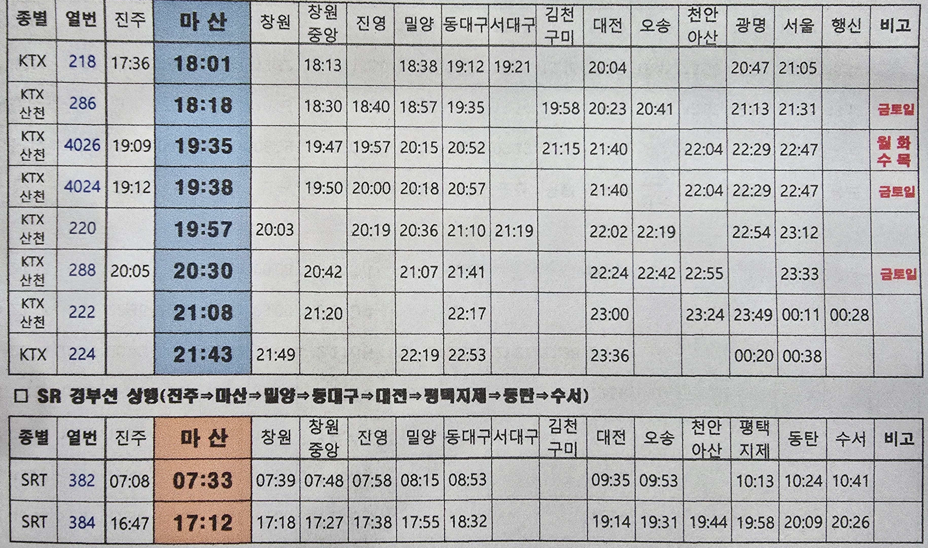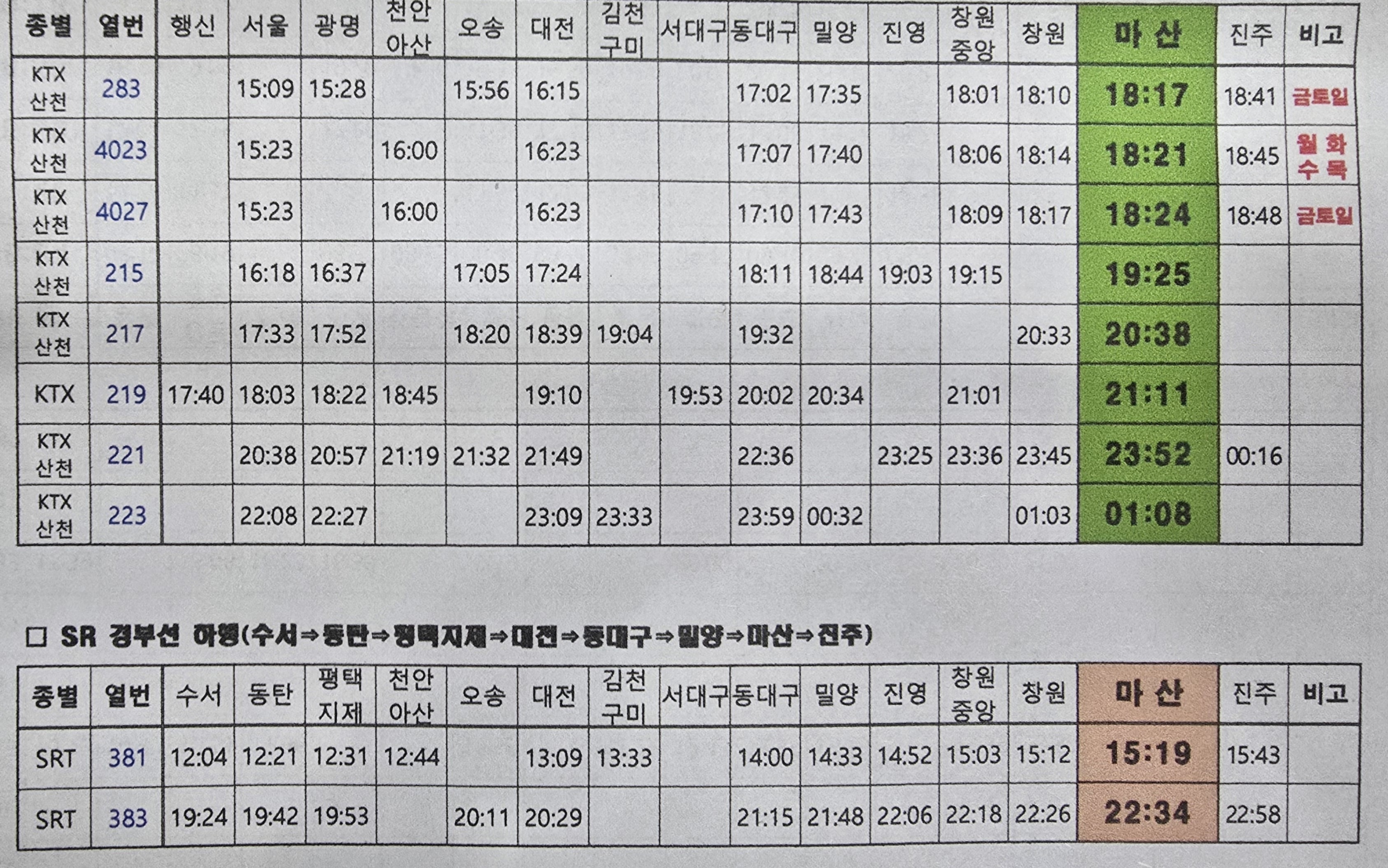 그리고 마산에서 서울역까지 운행하는 막차는 21시23분에 운행한다.