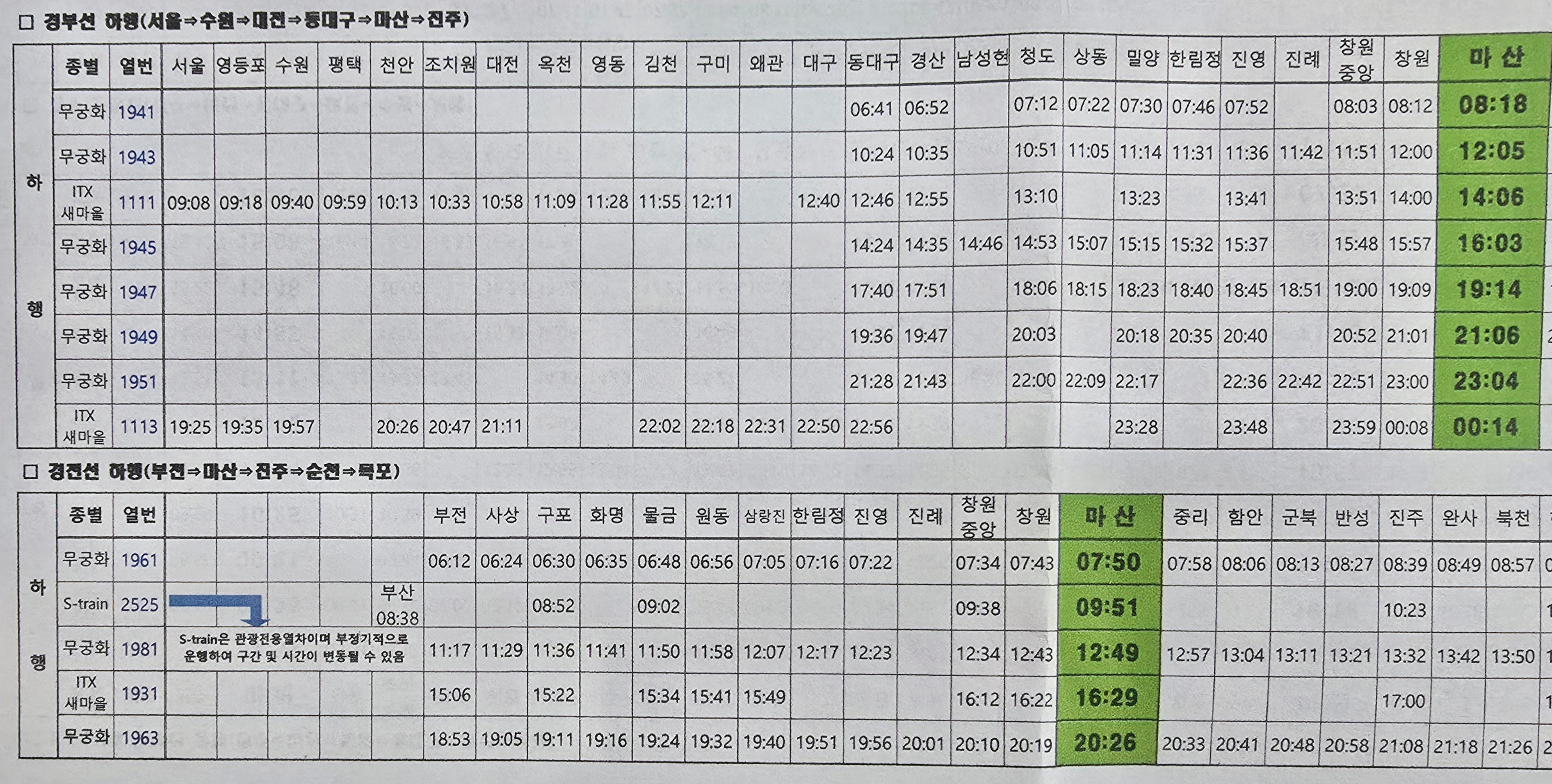 목포역과 부산역 구간을 운행하는 S-train 관광열차는 부정기적으로 운행하며 구간 및 시간이 변동될수 있는데 현재는 목포역에서 15시36분에 출발하여 부산역에는 20시39분에 도착한다.