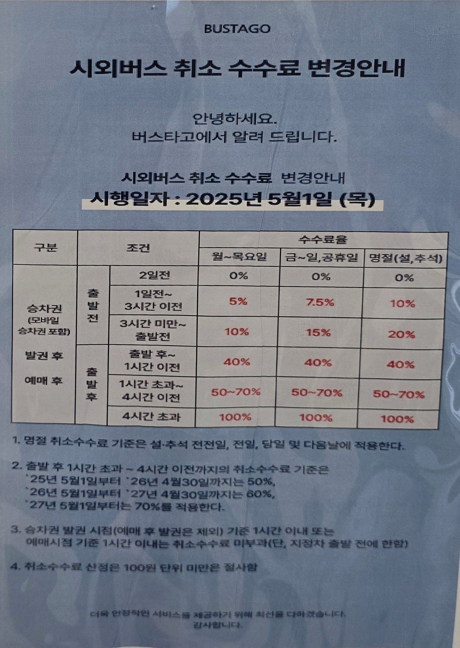 버스 출발전에 승차권을 구매하고 3시간 미만~버스 출발전에 환불할 경우에 월~목요일은 승차권 요금의 10%,금~일 공휴일은 15%,명절은 20%의 취소 수수료가 공제후 환불 된다.