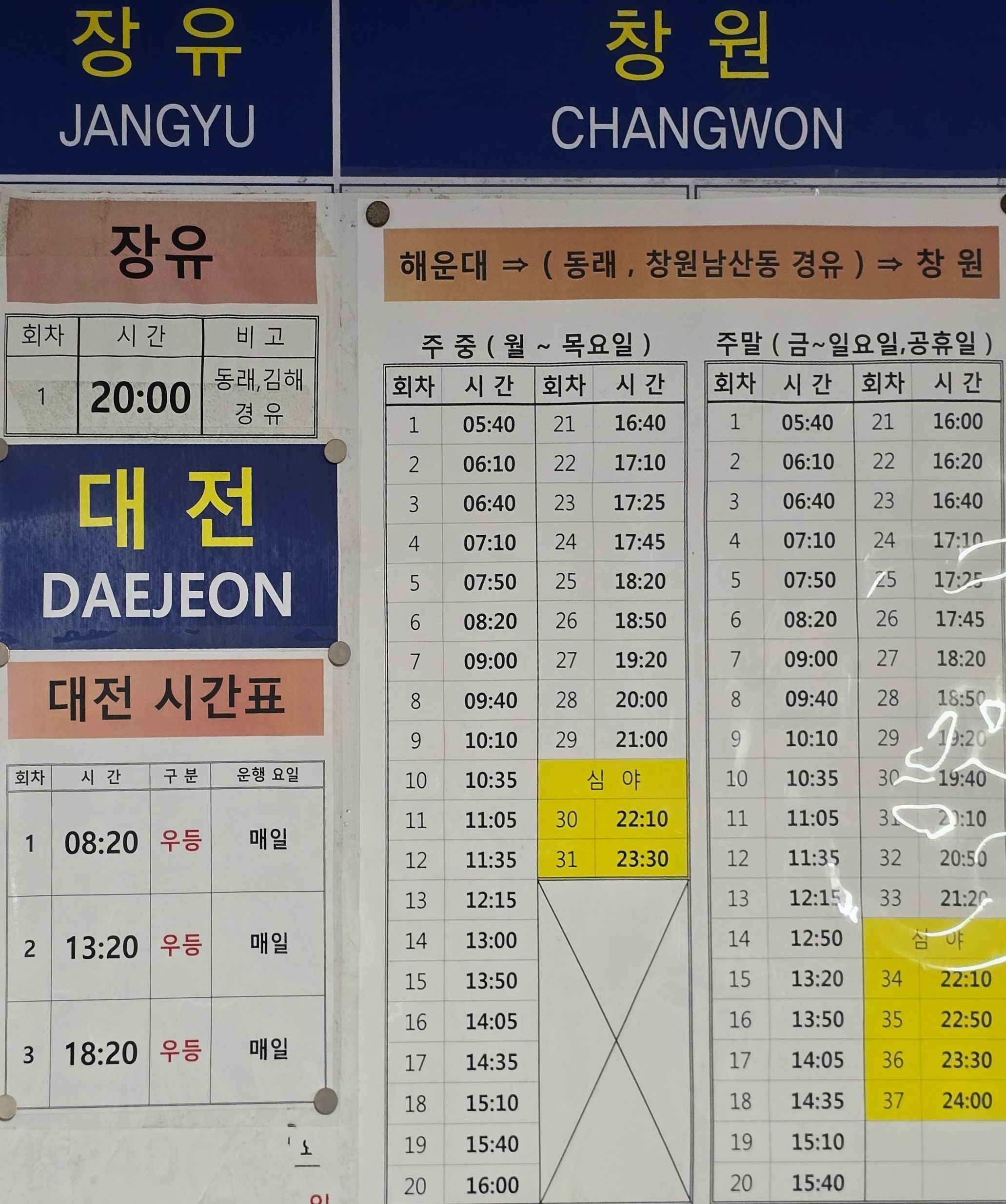해운대시외버스터미널에서 창원가는 시외버스는 월~목요일응 첫차가 05시40분,막차는 심야버스가 23시30분에 운행한다.