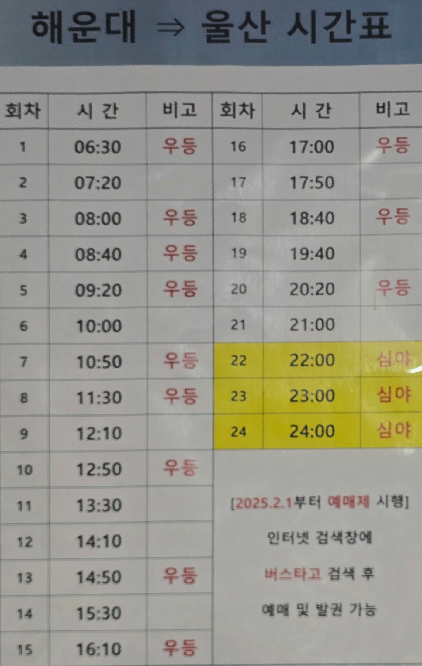 해운대시외버스터미널에서 울산가는 버스는 06시30분 첫차 우등버스를 시작으로 막차는 23시59분에 심야버스가 운행한다.