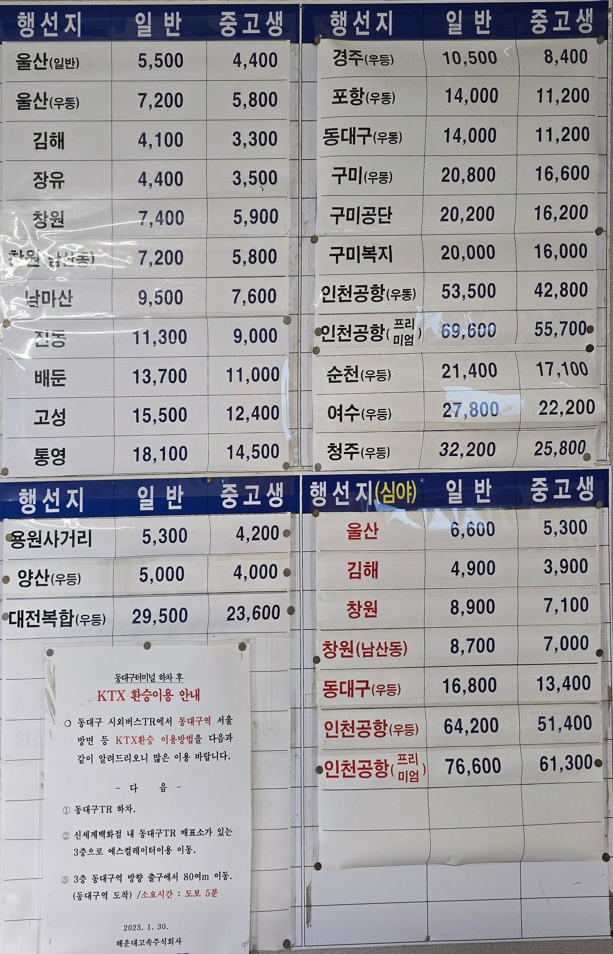 일반 우등버스 요금은 53,500원,프리미엄은 69,600원,심야프리미엄은 76,600원,심야우등은 64,200원이다.