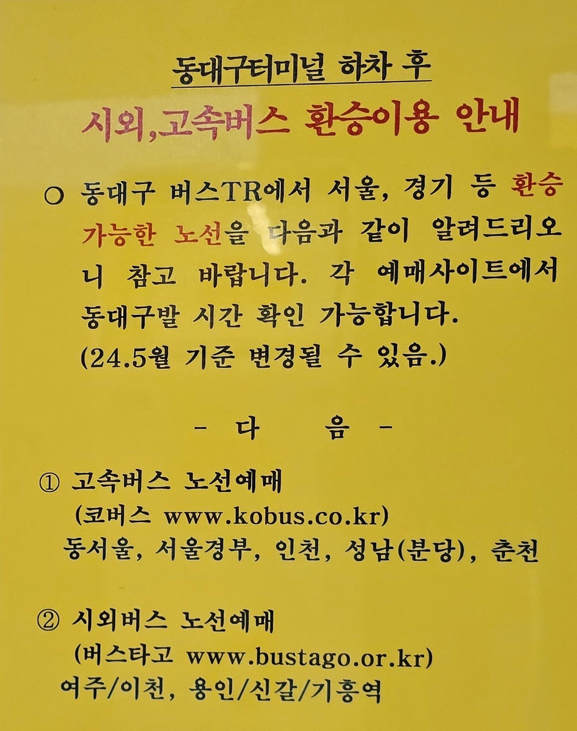 동대구터미널에서 환승할 경우 고속버스 예매는 '코버스'사이트에서 이용할 수 있고,시외버스는 '버스타고'사이트에서 이용할 수 있다.