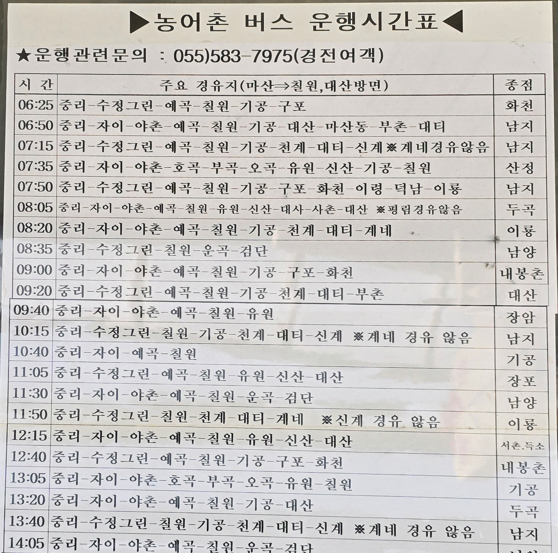 농어촌 버스 운행 관련 문의는 경전여객 055-583-7975이다.