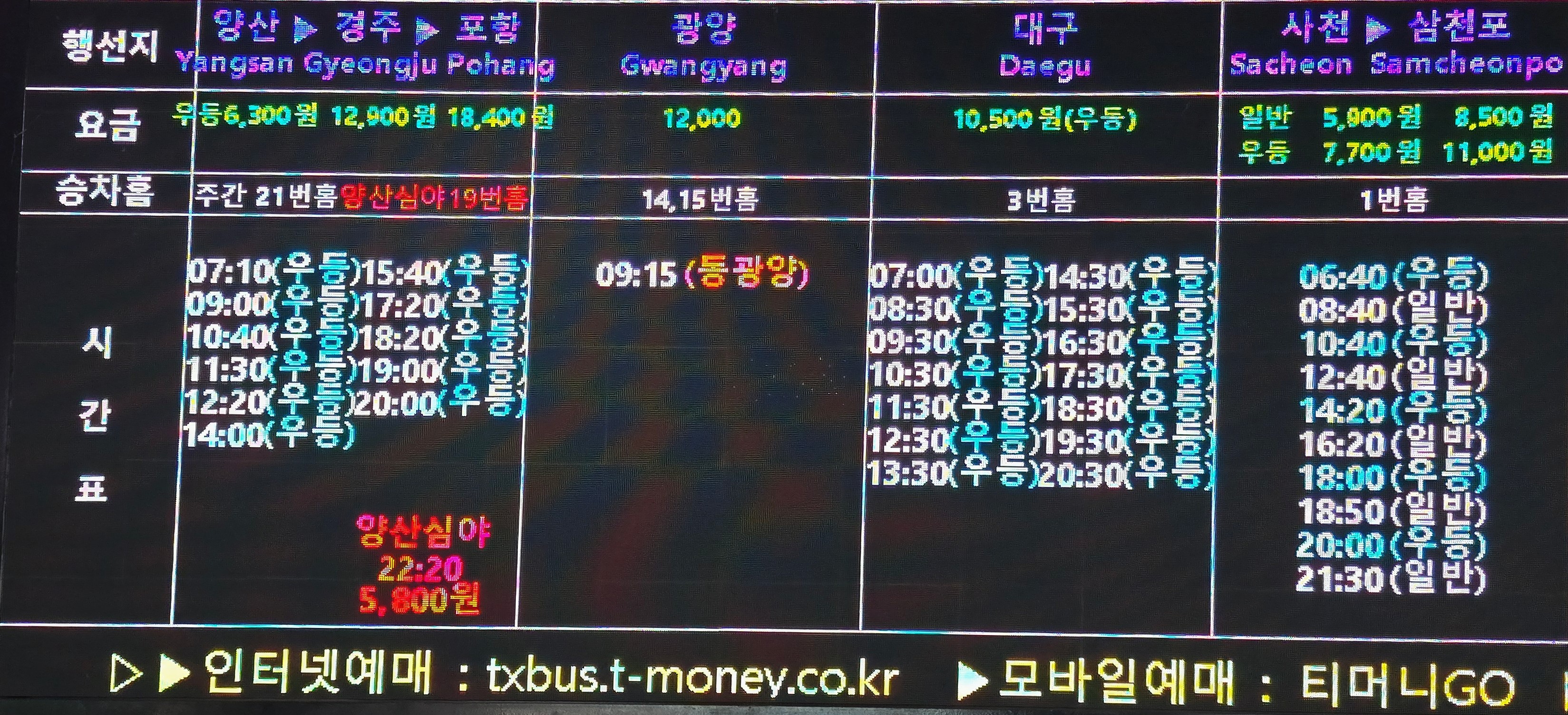 양산까지 우등버스 요금은 6,300원,경주는 12,600원,포항은 18,400원이다.