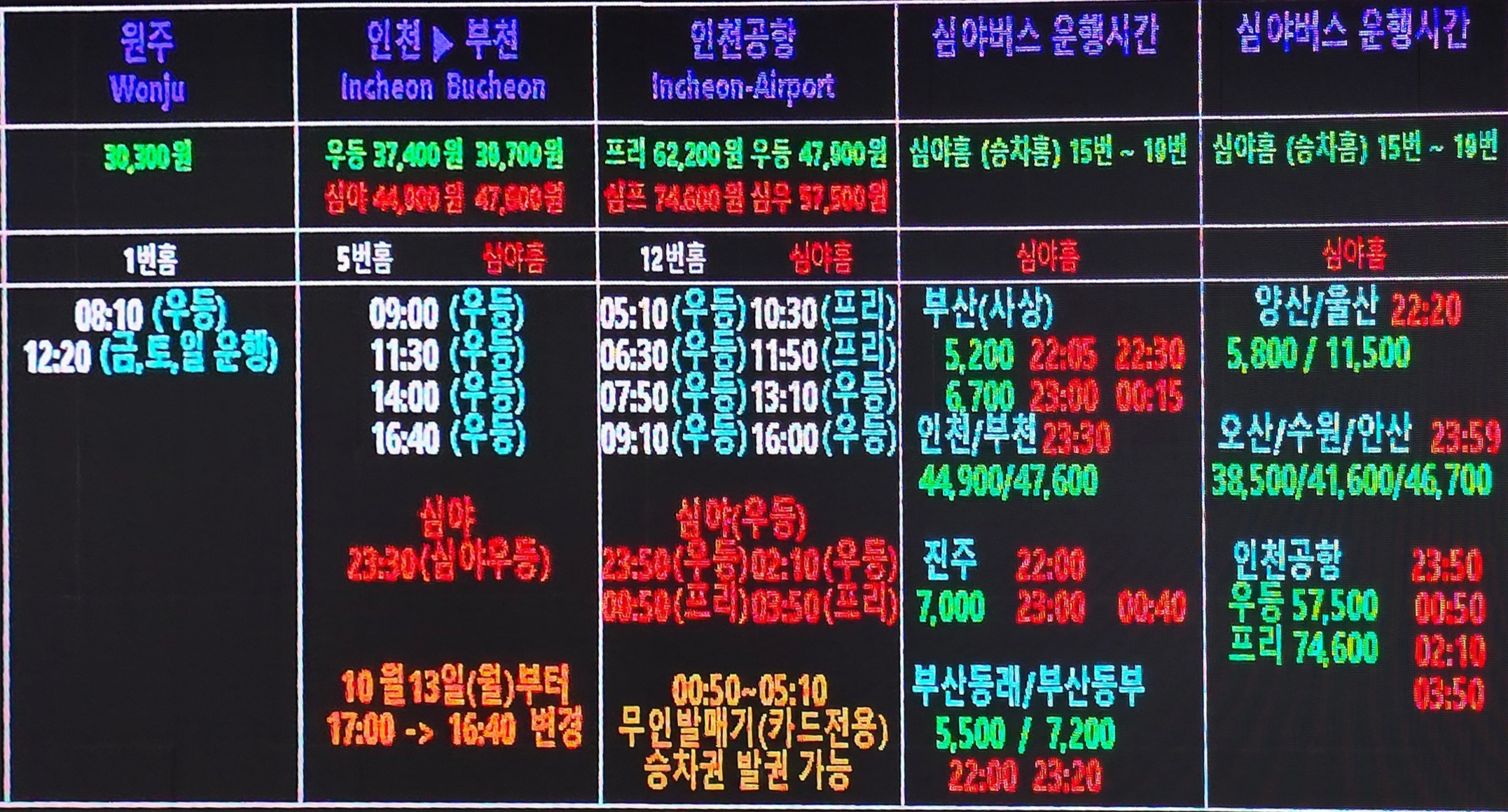 그리고 03시50분(프리미엄 심야),05시10분(우등),06시30분(우등),07시50분(우등),09시10분(우등),10시30분(프리미엄),11시50분(프리미엄),13시10분(우등),16시(우등)에 운행한다.